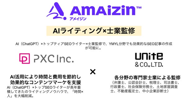 PXCは、士業コミュニティ「ミライ士業TEAMS」を企画運営するunite株式会社との事業提携により、「AIによるSEO記事作成×士業監修」を実現します。