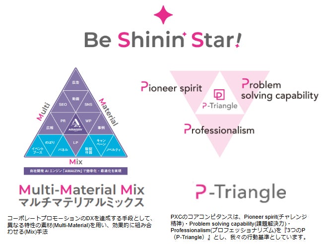 PXCは2つのマテリアル(ハンソクエスト:https://hansokuest.jp/の手法と、AMAIZIN:https://amaizin.biz/の手法)をMIXした「MMMピラミッド」とPXCのコアコンピタンス「P-Triangle」を合体させ、世界の一隅を照らす恒星になります