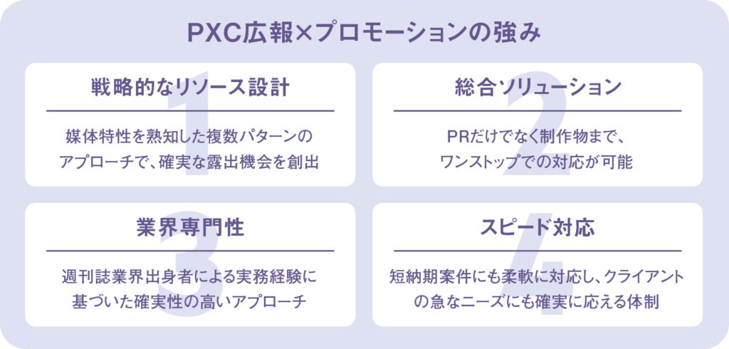 PXCでは、広報・PRの専門知識とリアルプロモーション領域で培ったノウハウで、お客様の商材特性に合わせた最適なPR戦略をご提案いたします。販促活動にお悩みの事業者様は、まずはお気軽にお問い合わせください。