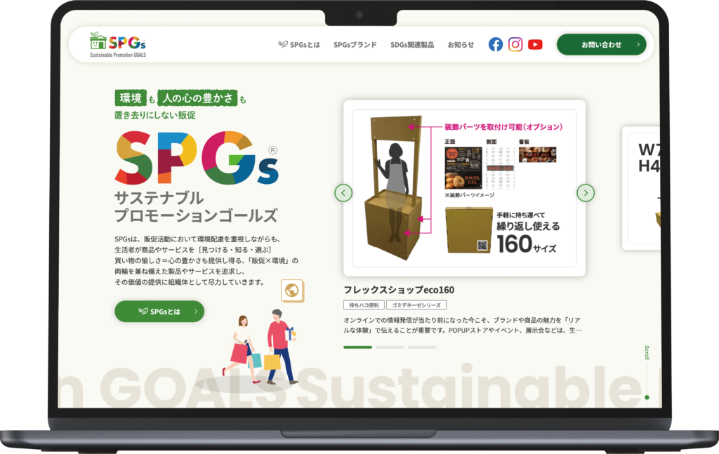 POPUPストアやイベント、展示会などは、生活者と直接触れ合い、ブランドの世界観を五感で感じてもらう絶好のチャンス。「フレックスショップeco160」は、そんなリアルなタッチポイントを手軽に生み出すために開発された、段ボール製・簡易組立式の店舗什器です。軽量かつ強度のある段ボール素材を使用し、工具を使わず短時間で組み立て・撤去が可能。持ち運び可能なコンパクト設計で、POPUPストアはもちろん、商業施設、オフィス、イベント会場、ホテル、屋外スペース(*1)など、場所を選ばず手軽に展開できます。また、オプションの「アドパーツ」を活用すれば、ブランドロゴや商品ビジュアルを印刷したパーツを簡単に装着可能。デザインの差し替えも自由で、季節キャンペーンや新商品の訴求など、シーンに合わせたプロモーション展開ができるため、ひとつの什器で、複数のイベントを効果的にサポートします。繰り返し使用できるサステナブル設計は、企業のSDGsへの取り組みを体現するツールとしてもお勧めです。