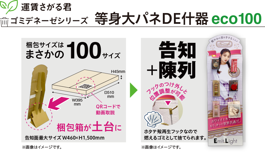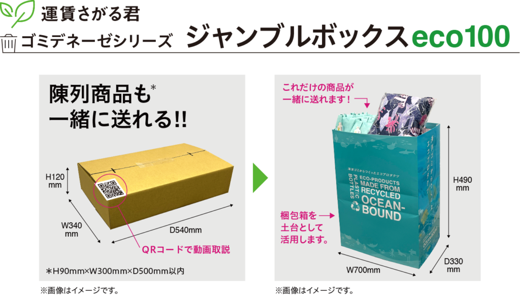 SPGsの運賃さがる君・ゴミデネーゼシリーズ「ジャンブルボックスeco100」は、商品と一緒に配送可能。組み立ても簡単で、どこでも誰でも素早く商品を展開することが出来ます。また外装ダンボール箱が什器の一部になり不要なゴミが一切出ず、梱包サイズもコンパクトな100サイズだから、発送運賃が従来型と比較して50%(*1)も削減できます。これにより販促資材の物量を減らし輸送時に発生するトラックのCO₂削減にも繋がります。