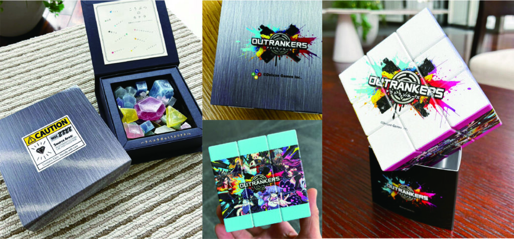 新タイトル「アウトランカーズ」は、200年後の崩壊都市で罪人たちが希望の鉱石「エルピス」を奪い合う、3人×3チームで競い合う3分間の強奪バトルゲーム。その世界観とゲーム内容をPRするノベルティとして、わたしたちは、オリジナルデザインの云わずと知れた3×3パズルゲーム「キューブパズル」と、希望の鉱石「エルビス」をイメージした「琥珀糖」など、複数アイテムをご提案し、実施にいたりました。