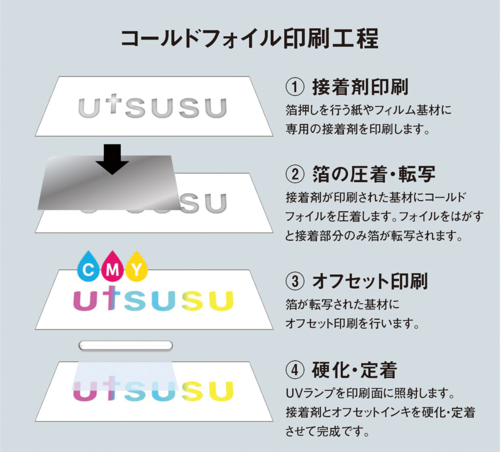 従来の箔押し加工といえば専用機械で加工を施していましたが、コールドフォイルはオフセット印刷機そのものに胴を組み込み、フルカラー印刷と同じ機械で箔押し表現が出来ます。​